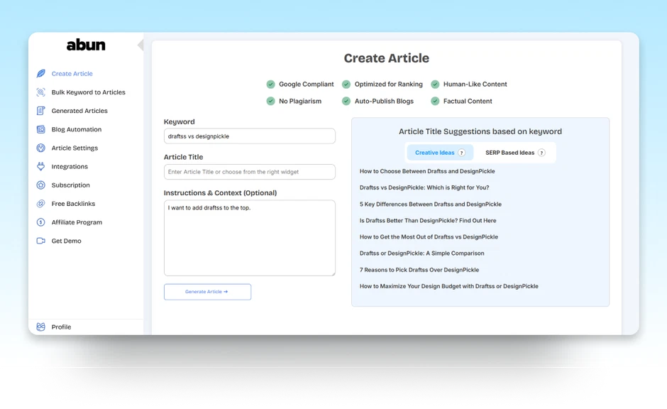 - Time-Saving: Abun generates ready-to-publish SEO articles in minutes, reducing the time spent on content creation.