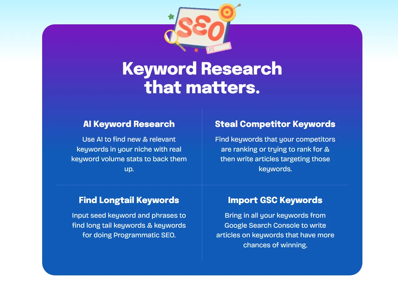 - Automated Workflow: The tool simplifies keyword research, content creation, and publishing, making it easier to manage content production.