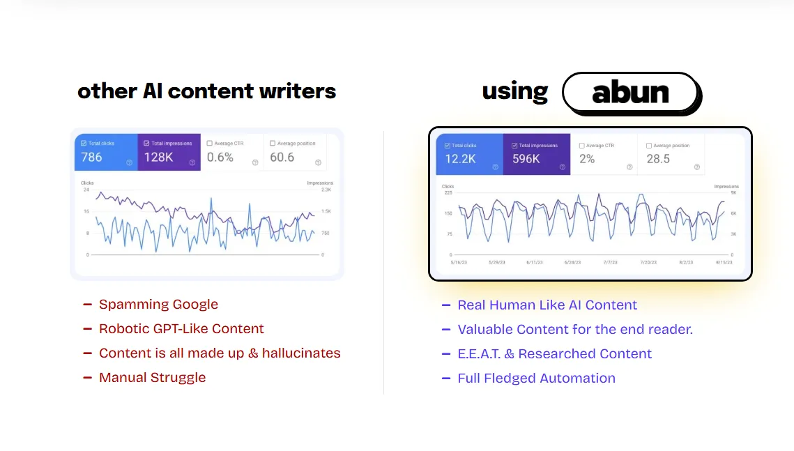 - Boosts Organic Traffic: Users have reported an increase in website traffic due to the high-ranking, SEO-optimized content produced by Abun.