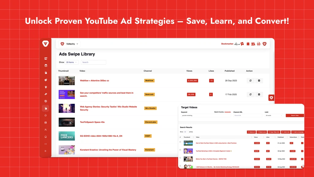 - Video & Channel Analytics: VidTechy provides competitive benchmarking, allowing you to compare your metrics against industry leaders. Visual dashboards show subscriber trends and demographic data in an easy-to-use format.